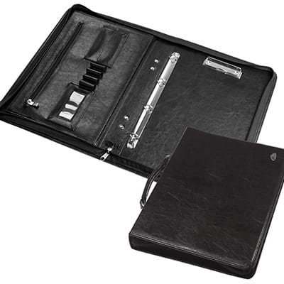 - wyposażona w kieszeń przestrzenną, kieszeń zamykaną na suwak, 2 kieszonki na wizytówki, kieszeń z okienkiem na wizytowniki, miejsce na długopis, ring 4R do wpinania, klip do utrzymywania notesu lub notatek