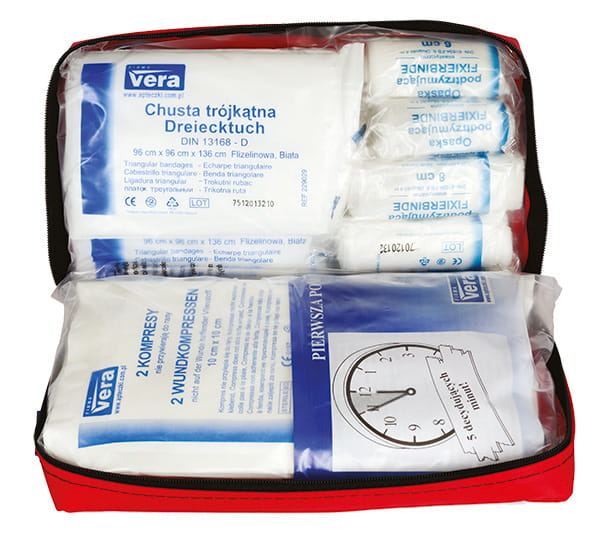 | zestaw zawiera: 3x kompres 10 x 10 cm (2x) sterylny 2x opaska elastyczna 4m x 6cm 3x opaska elastyczna 4m x 8cm 1x plaster 10 x 6 cm (8szt.) 1x plaster 5m x 2,5 cm 3x opatrunek indywidualny M sterylny 1x opatrunek indywidualny G sterylny 2x chusta opatrunkowa 40 x 60 sterylna 1x chusta opatrunkowa 60 x 80 sterylna 2x chusta trójkątna 1x koc ratunkowy 1x nożyczki14,5 cm 4x rękawice winylowe 2x chusteczka alkoholowa 1x ustnik do sztucznego oddychania 1x instrukcja udzielania pierwszej pomocy wymiary: 215x130x55mm skład zgodny z normą: DIN 13164 PLUS wyrób spełnia wymagania norm UE |