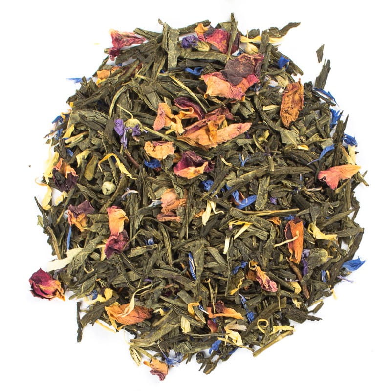 Składniki: zielona herbata Sencha, aromaty, kwiaty róży, kwiaty chabru, kwiaty nagietka, niebieskie kwiaty malwy.