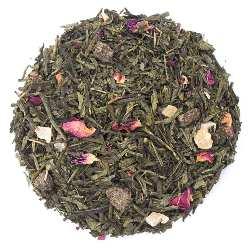 Składniki: zielona herbata (80%), kandyzowane mango, kandyzowana brzoskwinia, aromat, płatki róż.