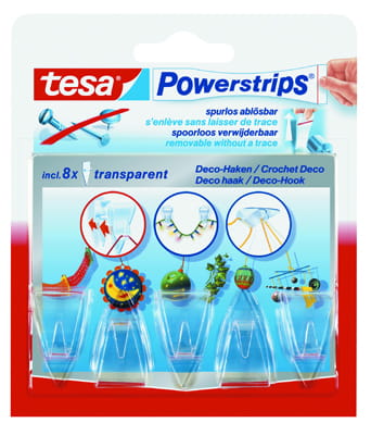 Przezroczyste, odporne na działanie promieniowania UV dekoracyjne plastry i haczyki tesa Powerstrips® umożliwiają pewne i szybkie mocowanie lekkich przedmiotów np. ozdób czy papierowych dekoracji.