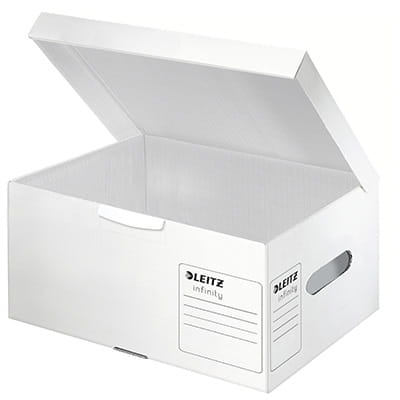 Pudła i teczki Leitz Infinity są rekomendowane do długoterminowej archiwizacji dokumentów w narodowych archiwach, muzeach, bibliotekach, szpitalach czy prywatnych firmach. Produkty Leitz Infinity spełniają najwyższe normy jakościowe ISO (16245-A). Innowacyjna konstrukcja z automatycznie składanym dnem oszczędza czas i wysiłek. Pudła są gotowe do użycia w kilka sekund. Wyprodukowane w 100% z bezkwasowej tektury z włókien pierwotnych (virgin). Wszystkie pudła archiwizacyjne Infinity są wykonane z lekkiej, a jednocześnie wytrzymałej tektury falistej, której wytworzenie pochłania do 60% mniej surowca w porównaniu z powszechnie stosowanym kartonem.