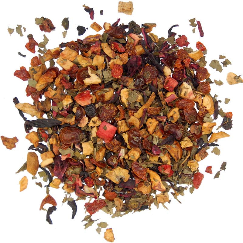 Składniki: kawałki jabłek, hibiskus, skórka z dzikiej róży, słodkie liście jeżyn, aromat, kawałki truskawek (2,8%)