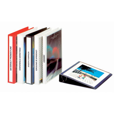 - oklejony na zewnątrz i wewnątrz PCV, na grzbiecie i na przedniej okładce przeźroczysta kieszeń