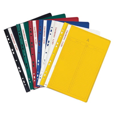 Obie okładki sztywne, nieprzezroczyste z wysokiej jakości kolorowej folii, wyposażony w wysuwany, papierowy pasek do opisu, zaokrąglone rogi obu okładek, posiada boczną perforację, jednostka sprzedaży 1 opakowanie (10 sztuk).