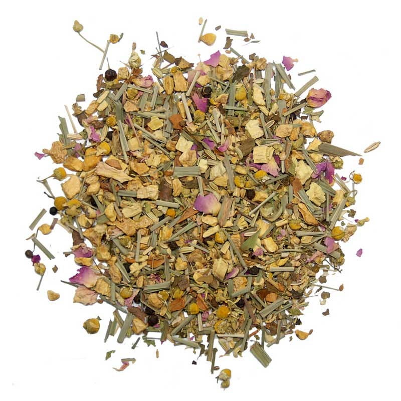 Składniki: imbir, anyż, korzeń lukrecji, trawa cytrynowa, czarny pieprz, cząstki cynamonu, kwiaty rumianku, słodkie liście jeżyn, płatki róż, werbena cytrynowa.