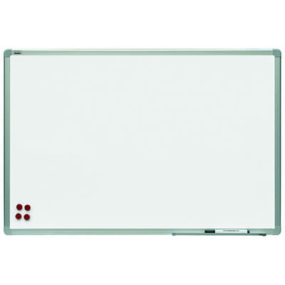Tablica biała suchościeralna o powierzchni magnetycznej lakierowanej. Rama wykonana z profilu aluminiowego w kolorze srebrnym, wykończona eleganckimi, popielatymi narożnikami. Dla rozmiarów 150x100 cm i większych tył tablicy wzmocniono blachą ocynkowaną. Dodatkowo produkt posiada wygodną półkę o długości 30 cm, która zmieści wszelkiego rodzaju przybory niezbędne podczas prezentacji. Bardzo łatwa i szybka w montażu. Możliwość zawieszenia tablicy zarówno w pionie, jak i w poziomie.