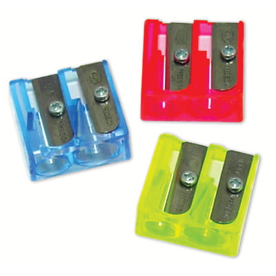 Temperówka podwójna Laco - w kształcie kostki, w transparentnej, fluorescencyjnej obudowie z trwałego granulatu plastikowego. Stalowe ostrze mocowane wkrętem - jednostka sprzedazy 1 sztuka