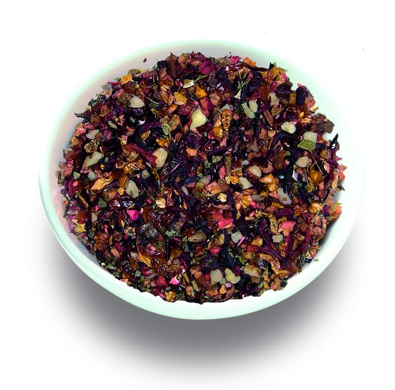 Składniki: hibiskus, jabłko, kawałki skórki róży, cząstki migdałów, słodkie liście jeżyn, aromat, kawałki malin, kawałki cynamonu, skórki pomarańczowej, płatków róży.