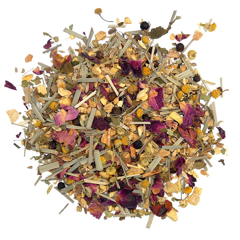 Składniki: imbir, anyż, koper włoski, korzeń lukrecji, trawa cytrynowa, czarny pieprz, cynamon, kwiat rumianku, słodkie liście jeżyn, płatki róż, werbena cytrynowa
